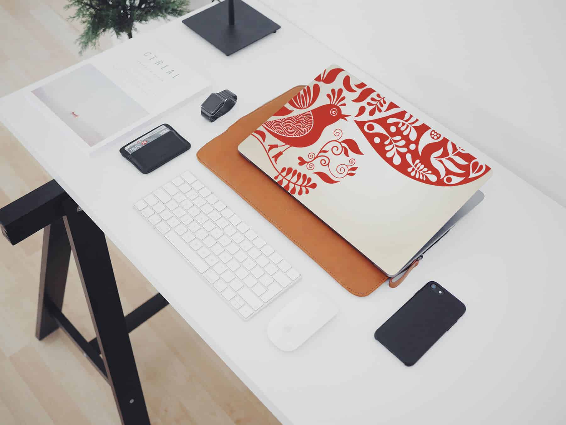 Sticker, die im Memphis-Stil gehalten sind, sind eine tolle Lösung. Bunte, geometrische Darstellungen, die ein wenig an die Comic-Ästhetik erinnern, eignen sich nicht nur für einen jugendlichen Computer. Der zweite Vorschlag ist ein Muster, das sich auf die Volkskunst bezieht. Wir können in der einheimischen Folklore nach Ideen suchen oder auf skandinavische Motive wie Dalapferde setzen. Die letzte Lösung ist ein Sticker im Stil Mid-century modern. Dies ist ein Vorschlag, der von Liebhabern des Vintage-Stils geschätzt wird, denn dieser Begriff betrifft ein für die 50er, 60er und 70er Jahre des 20. Jahrhunderts typisches Design.